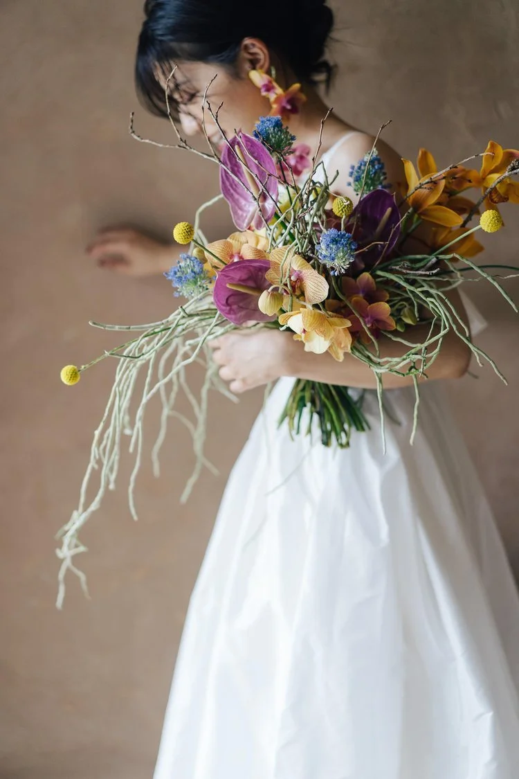 温暖な気候の沖縄の鮮やかさを表現した花束。リズム感のある素材で、持つ人の心まで明るく彩ってくれる花束です。
