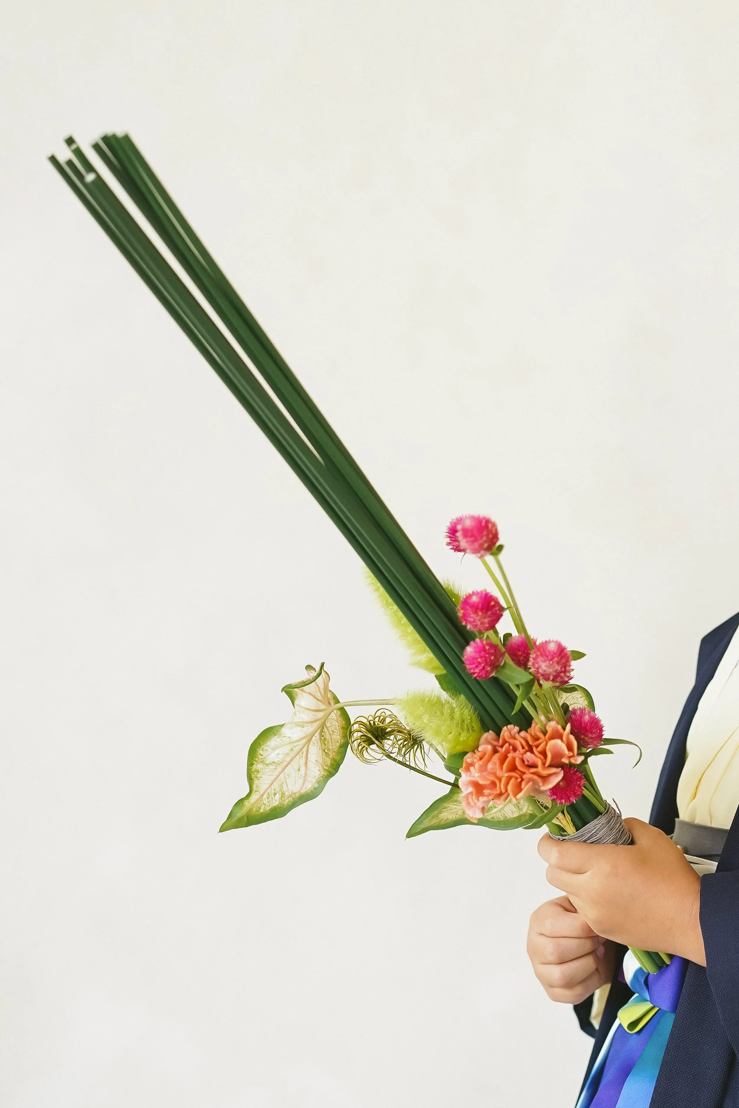 フローリストが直接市場に出向き、その日に出会った生花でつくるお子さまのための世界に一つだけの花束。撮影中にパパママから「おめでとう」の気持ちを込めてお渡しください。