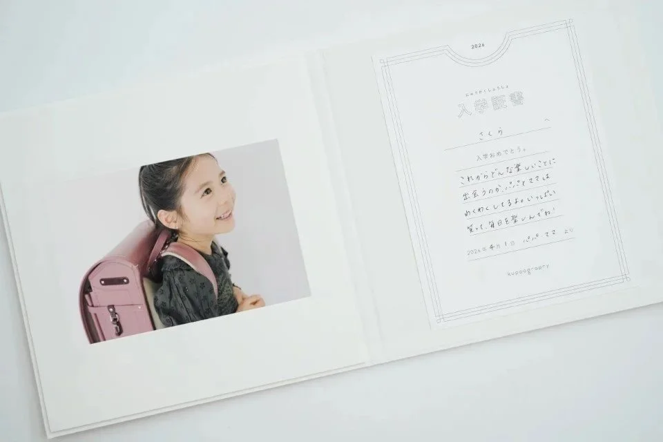 証書の片側には、思い出の一枚を添えて。何度も見返すことのできる、家族の思いが詰まった入学証書です。
