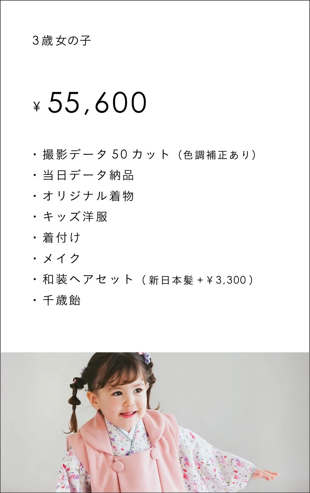 ごきょうだいで七五三撮影を行う方のためのオプションです。3歳女の子の和装用ヘアメイク・着付け・千歳飴がセットになったサービス。料金内でレンタル着物をご利用いただけます。