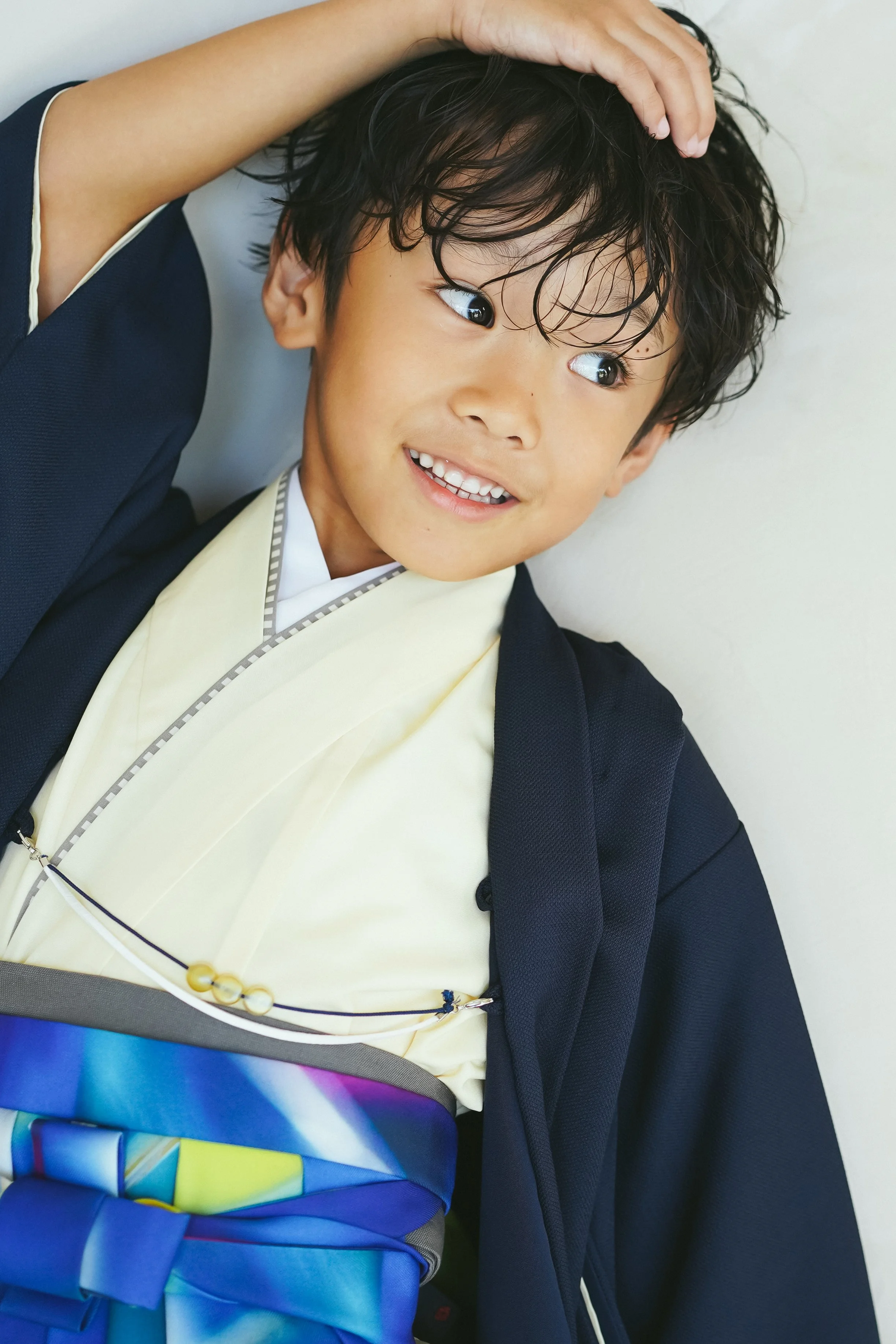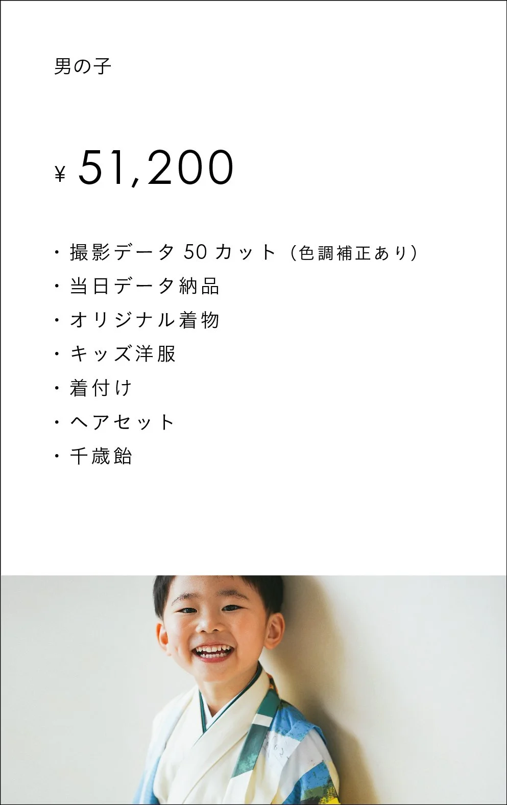 男の子のヘアセット・着付け・千歳飴がセットになったサービス。料金内でレンタル着物をご利用いただけます。