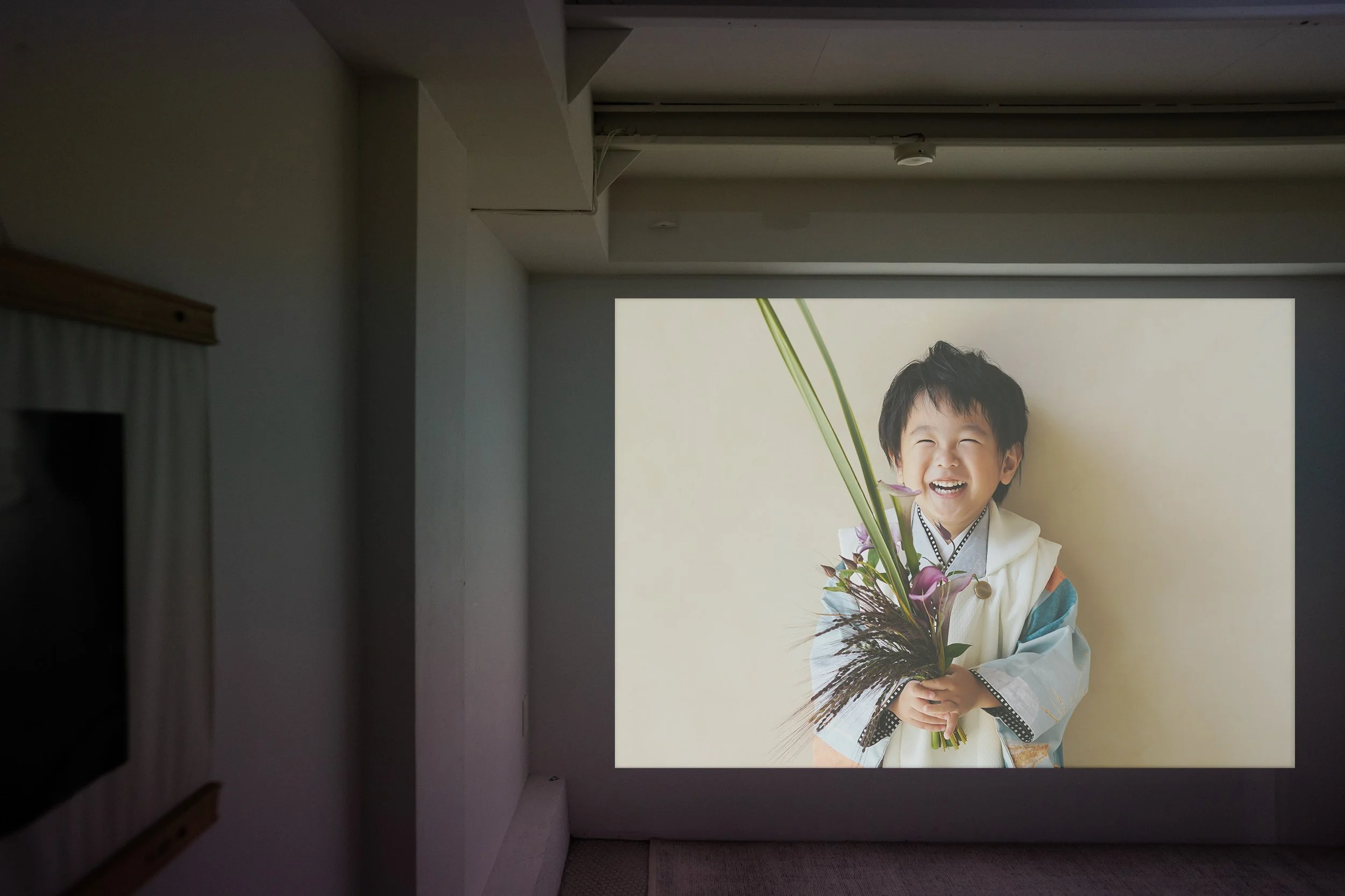 また、一緒に鑑賞するパパママは、「かわいい!」「〇〇らしいね!」と歓声を上げられる方もいらっしゃれば、お子さまの成長に感極まられる方も。七五三という記念日が、ご家族の今までを振り返る時間になればという思いも込めて、スライドショー鑑賞会を開催しています。