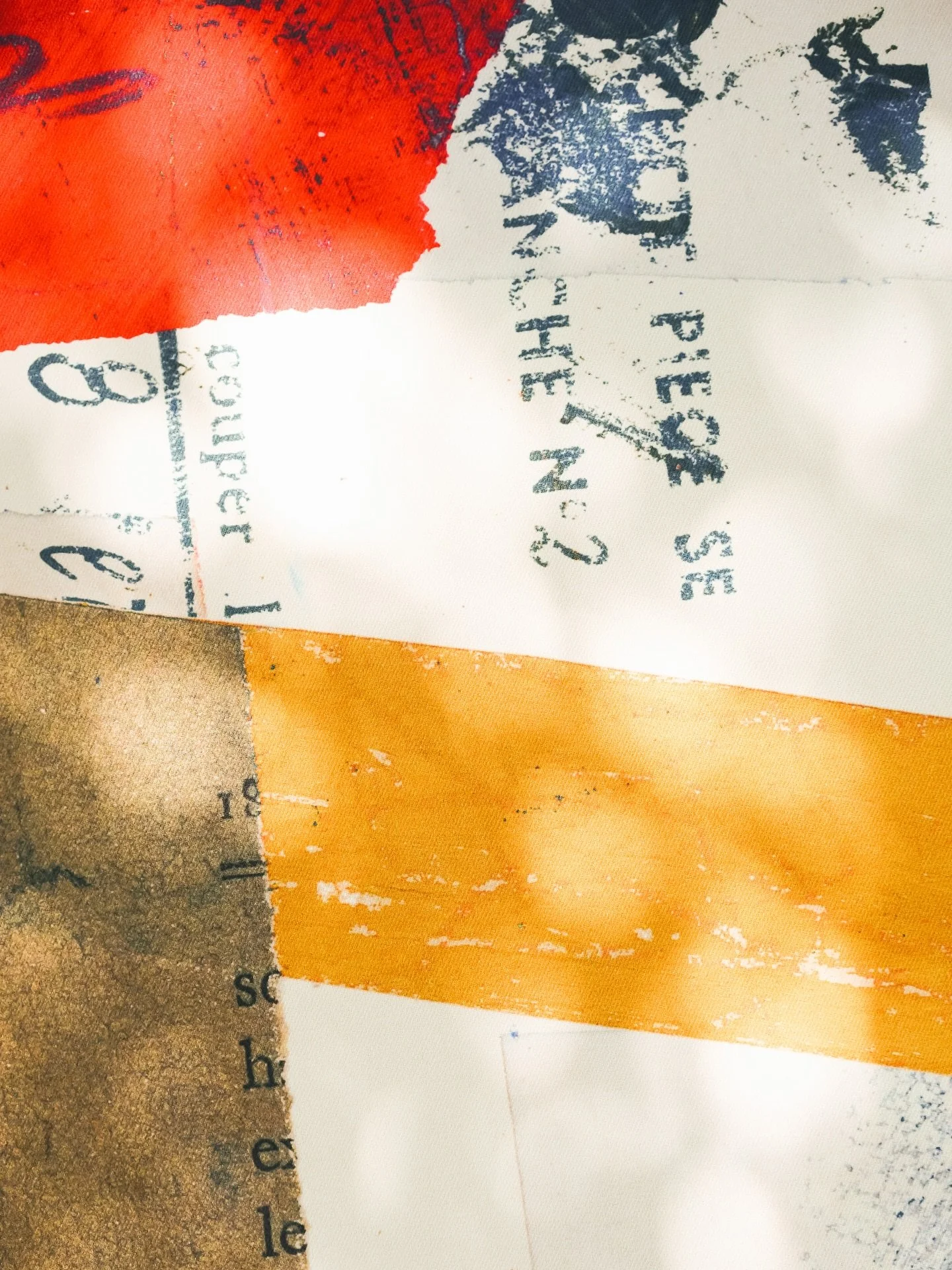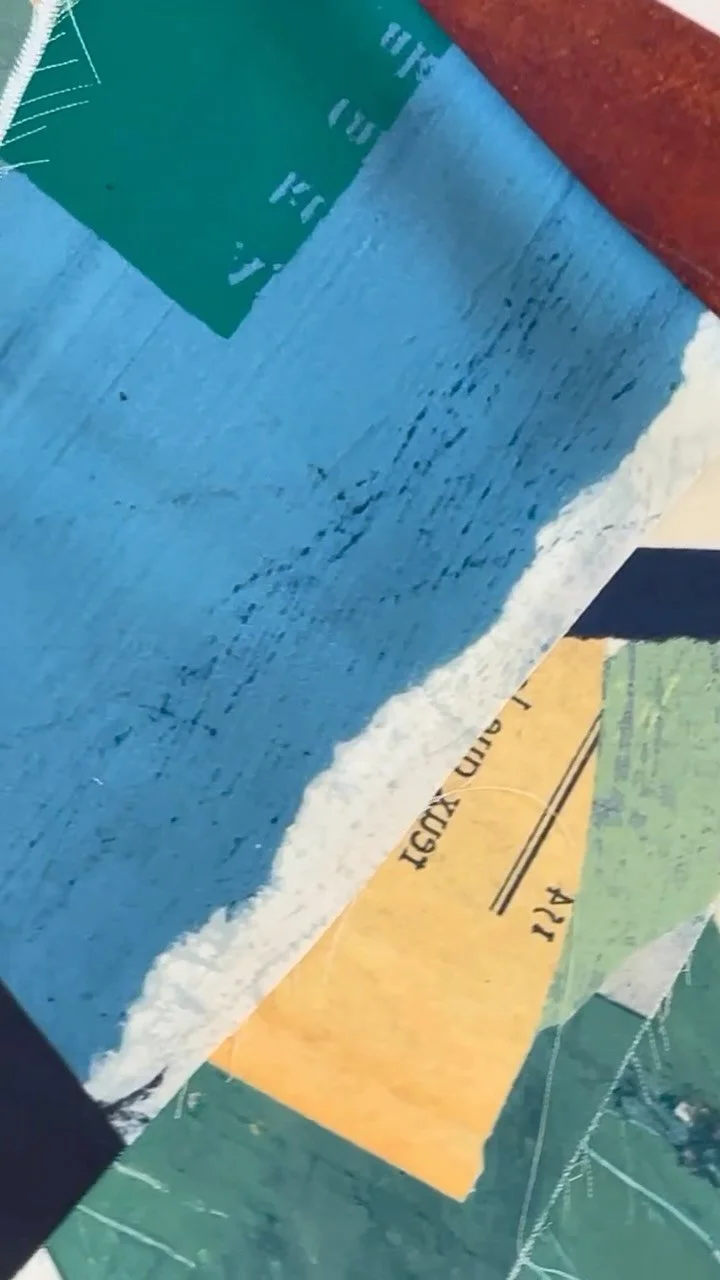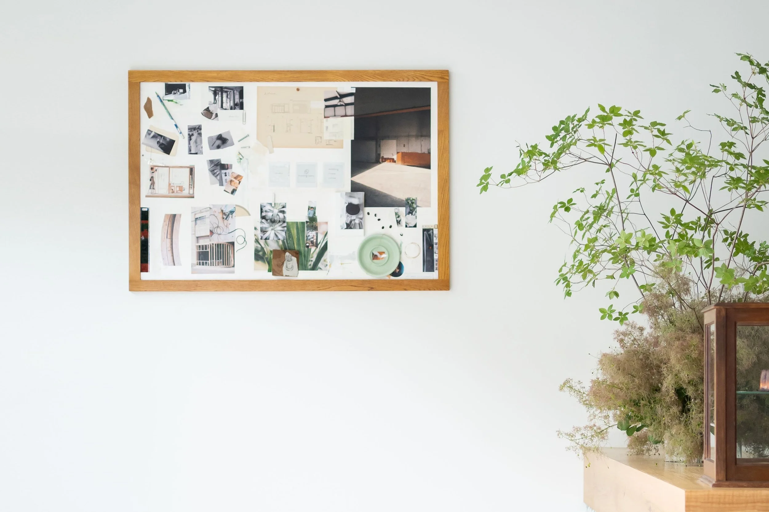 駒沢公園スタジオの図面、工事前や工事中の写真、カフェで使用しているソーサーやコーヒー豆など、スタジオにまつわるあらゆるものから制作されているスタジオを象徴するアート。