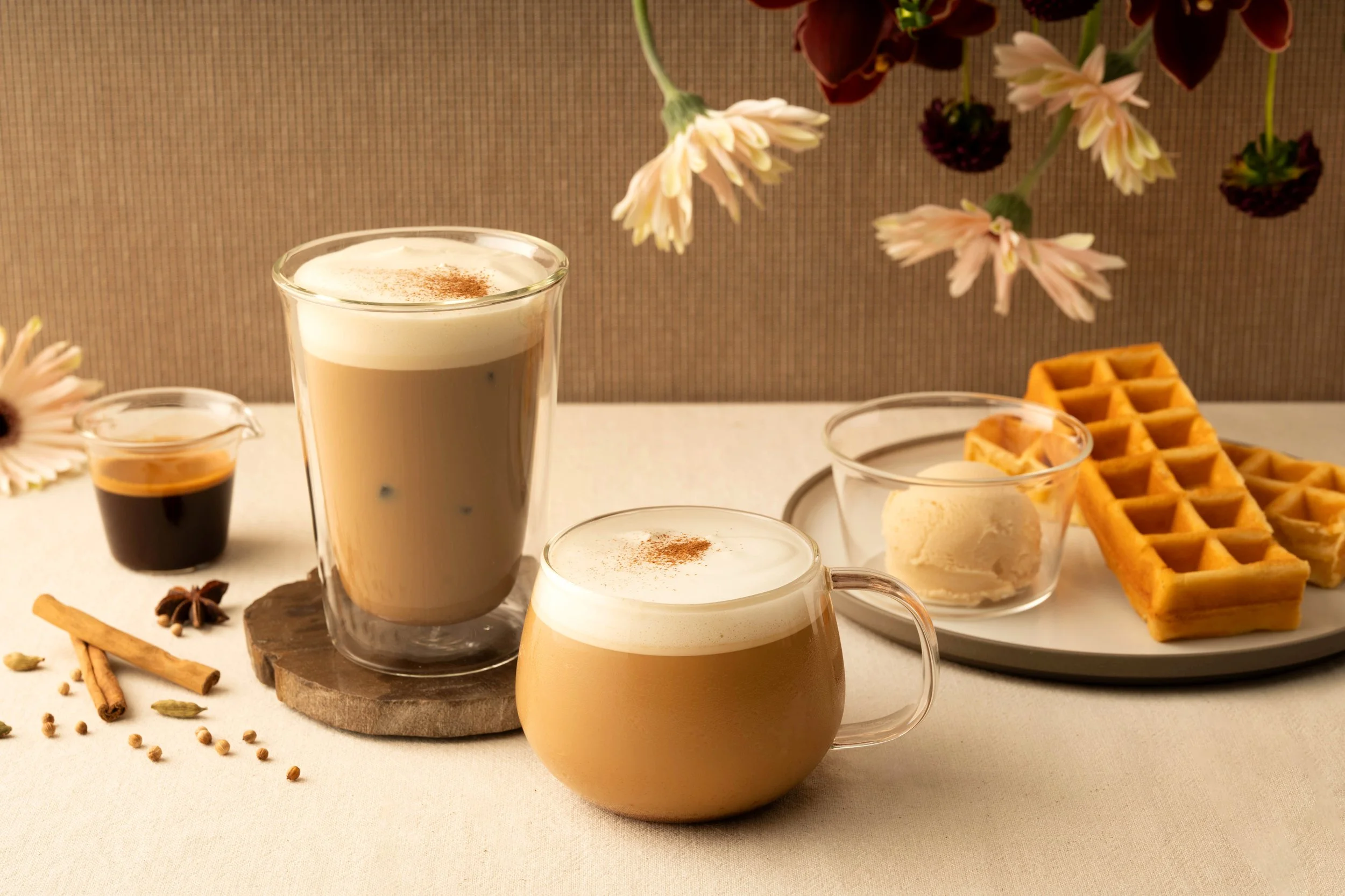 自家製のチャイティーベースに、エスプレッソとソイミルクを合わせた、秋を感じるスパイスミルクティー。シナモンやカルダモン、クローブなど数種類のスパイスをブレンドし、アッサム・シロニバリ茶園の茶葉と一緒に丁寧に煮出しました。