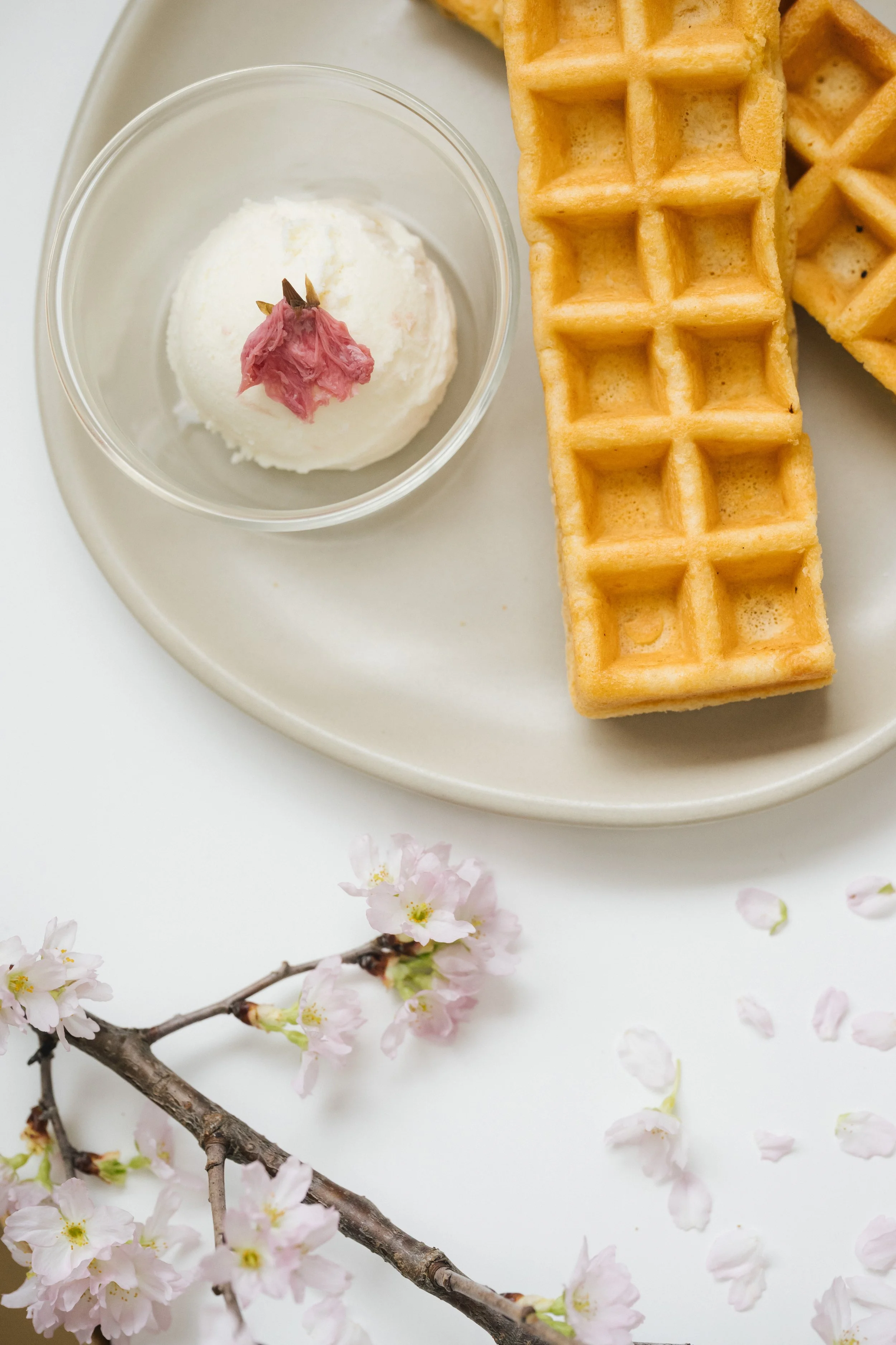 クッポグラフィー人気No.1スイーツ「自家製ワッフル」に、鎌倉の人気イタリアンジェラート店「GELATERIA SANTi」直送の期間限定フレーバー、“桜”をトッピングしたシーズナルワッフルとドリンクのセット。